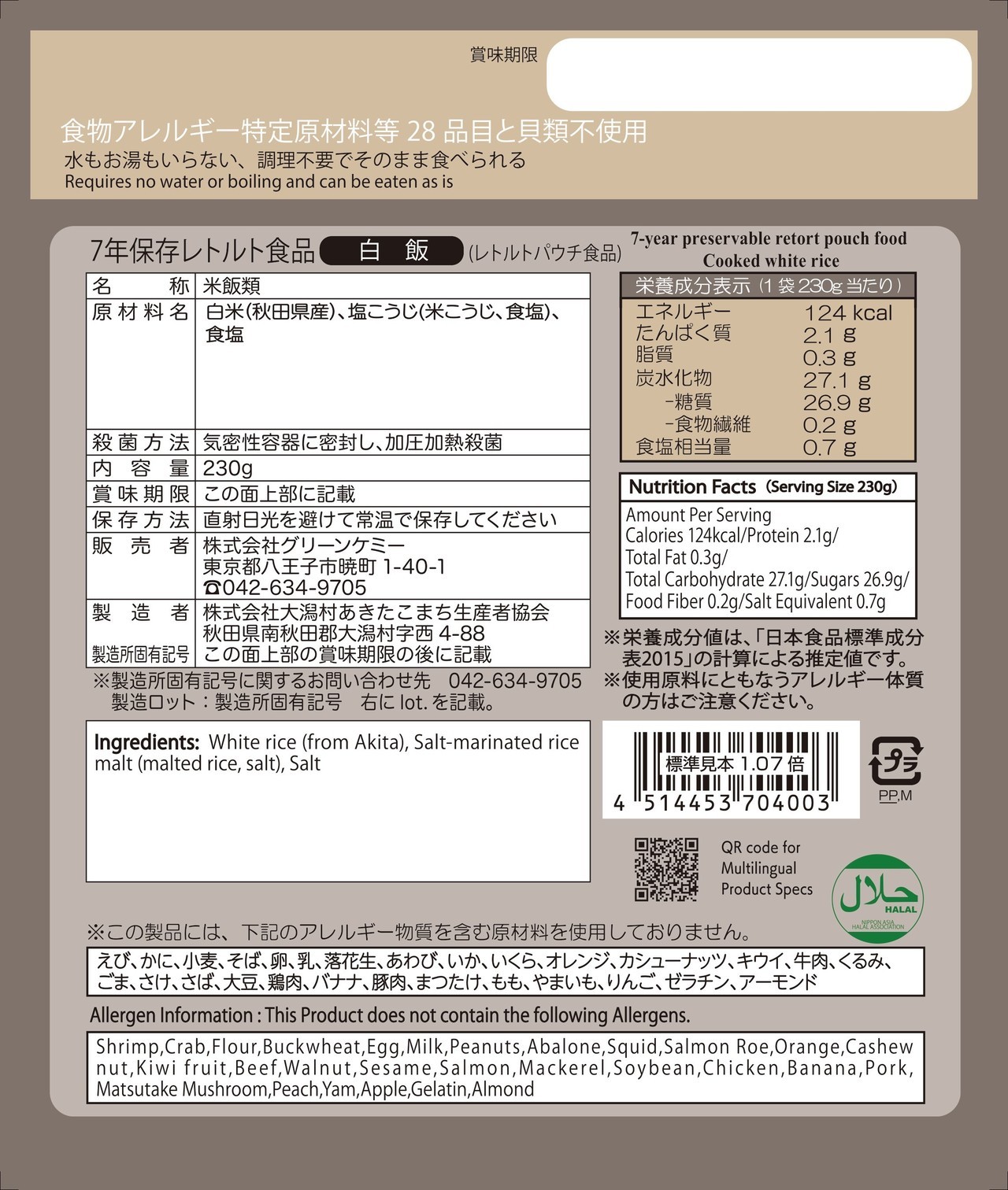 白飯・1箱50袋:21,500円 [参考価格・1袋:430円(税別)]