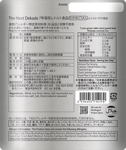 | Ingrédients | Pilaf au curry : Riz blanc (préfecture d'Akita), légumes (oignon, carotte), huile d'olive, curry roux (amidon de maïs, sucre, poudre de cari, sel, huile de palme, fécule de pomme de terre, poudre de tomate, extrait de levure, poudre d'oignon), koji au sel (koji de riz, Sel), maïs (maïs, sel), bouillon (sel, sucre, extrait de levure, dextrine, oignon, épices), sel |
